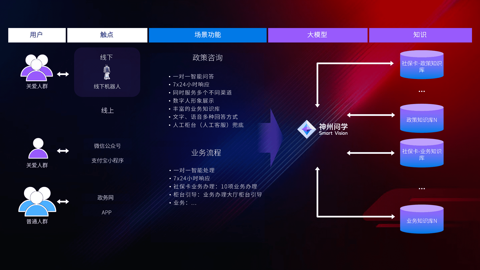 • 线上线下全覆盖:线上提供微信公众号、、、支付宝小程序、、、政务网、、、app多种渠道,,与线下机器人形成完整服务体系。。。