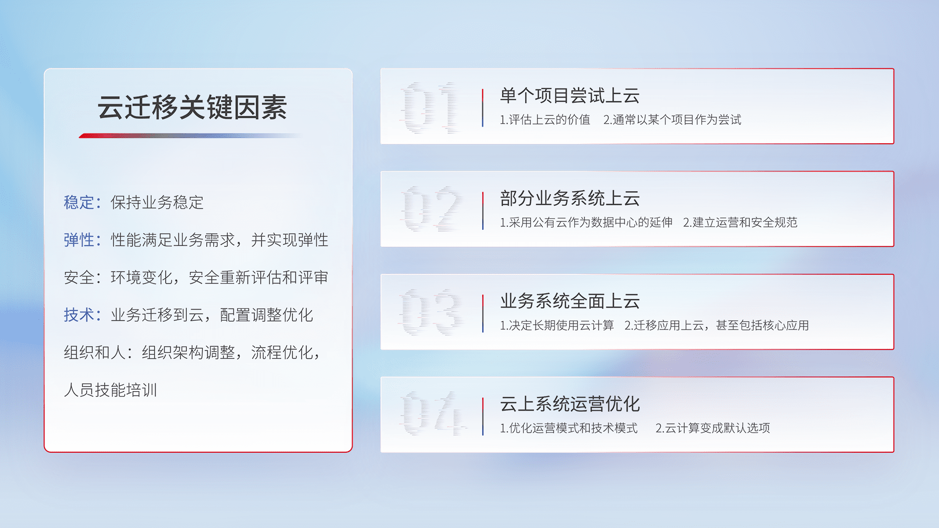 结合实际业务,,,从规划设计、、、云平台选型、、云原生改造、、、、数据迁移、、集成交付,,,迁移全过程为客户识别最佳上云路径,,做好风险识别管理,,,,设计网络架构、、身份权限、、、安全审计合规、、、、操作审计、、、日志审计、、、、监控告警策略、、、、多站点容灾设计等,,,,对云上基础设施进行整体规划,,,,提升IT治理水平,,,以满足弹性、、、、高可用、、高性能的需求。。